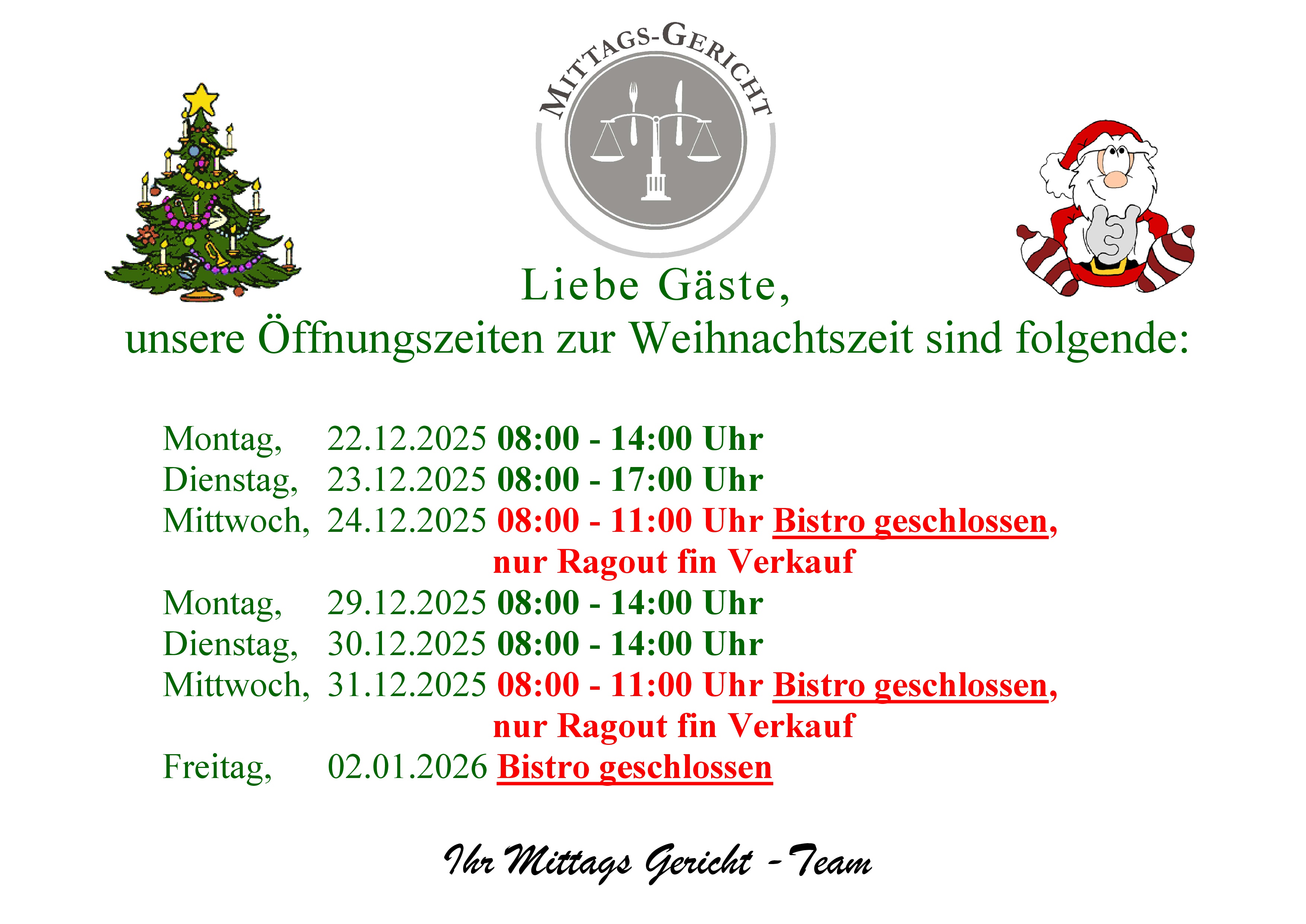Werte Gäste, bitte beachtet, dass wir am Freitag, dem 28.11.2025 unser Bistro schon um 13 Uhr schließen.